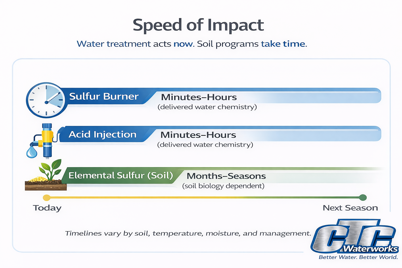 Water treatment addresses that pressure immediately. Soil-applied elemental sulfur does not.